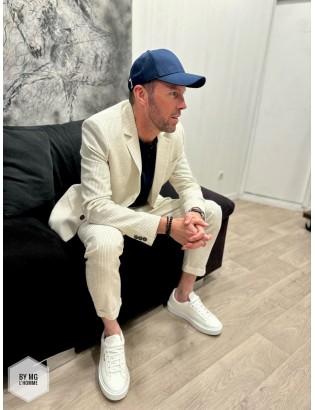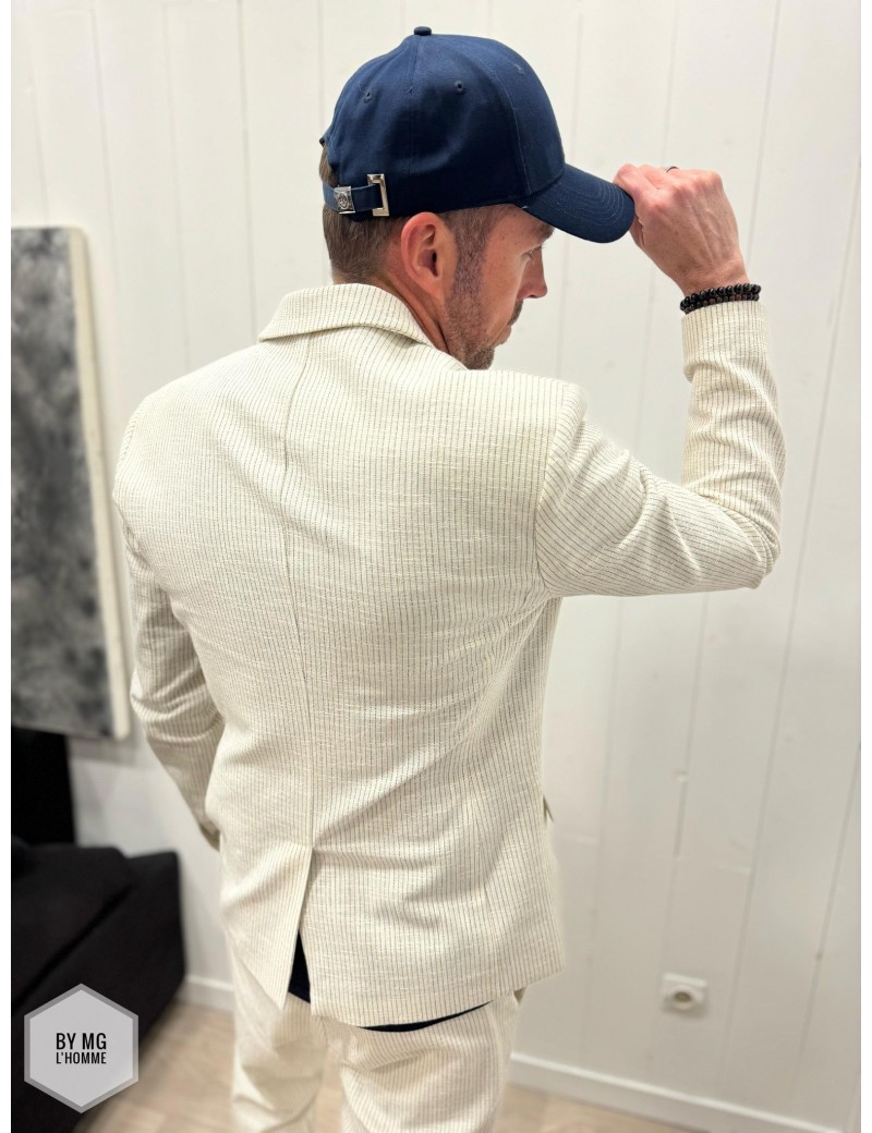 Portez le blazer en toutes circonstances avec "ALEC" la nouveauté printemps été 2024 by #imperial. Écru à fines rayures marine, il est parfait seul avec un jean ou associé au pantalon "ALEC" pour un total look Imperial.
